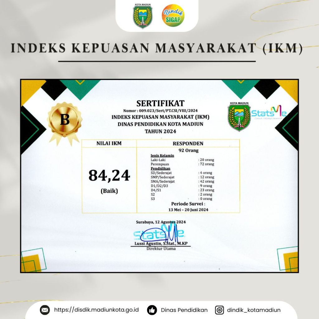 Indeks Kepuasan Masyarakat (IKM) Tahun 2024 dindik August 13, 2024 Berdasarkan hasil Indeks Kepuasan Masyarakat (IKM) Tahun 2024 Dinas Pendidikan Kota Madiun berhasil meraih 84.24 dengan kategori Baik. SALAM PENDIDIKAN, DINDIK SIGAP!! dinaspendidikan #dindikkotamadiun #dindiksigap #madiun2025 #pendidikanindonesia #kotamadiunkarismatik #madiuntoday #madiunkotapendekar About the Author dindik Administrator Visit Website View All Posts Post navigation Previous: DAFTAR PEGAWAI DINAS PENDIDIKAN KOTA MADIUNNext: Pemerintah Kota Madiun melalui Dinas Pendidikan Kota Madiun telah membuka pendaftaran Be Smart Kota Madiun Tahun 2024