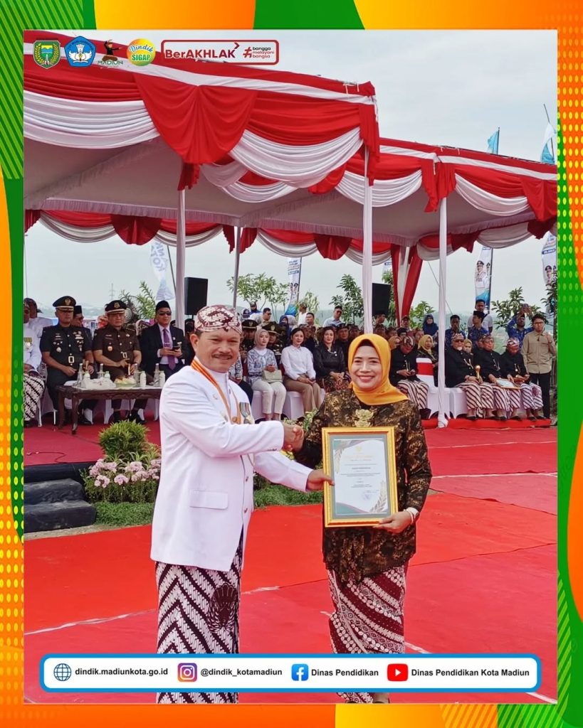 Penghargaan tersebut diserahkan langsung oleh Wali Kota Madiun Bapak Dr. Drs. H. Maidi, S.H., M.M., M.Pd, kepada Kepala Dinas Pendidikan Kota Madiun Dr. Lismawati, S.Pd., M.Pd. usai upacara peringatan Hari Jadi ke-107 Kota Madiun.