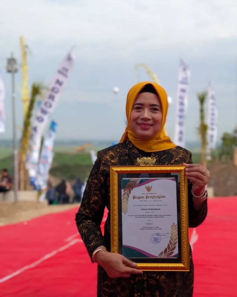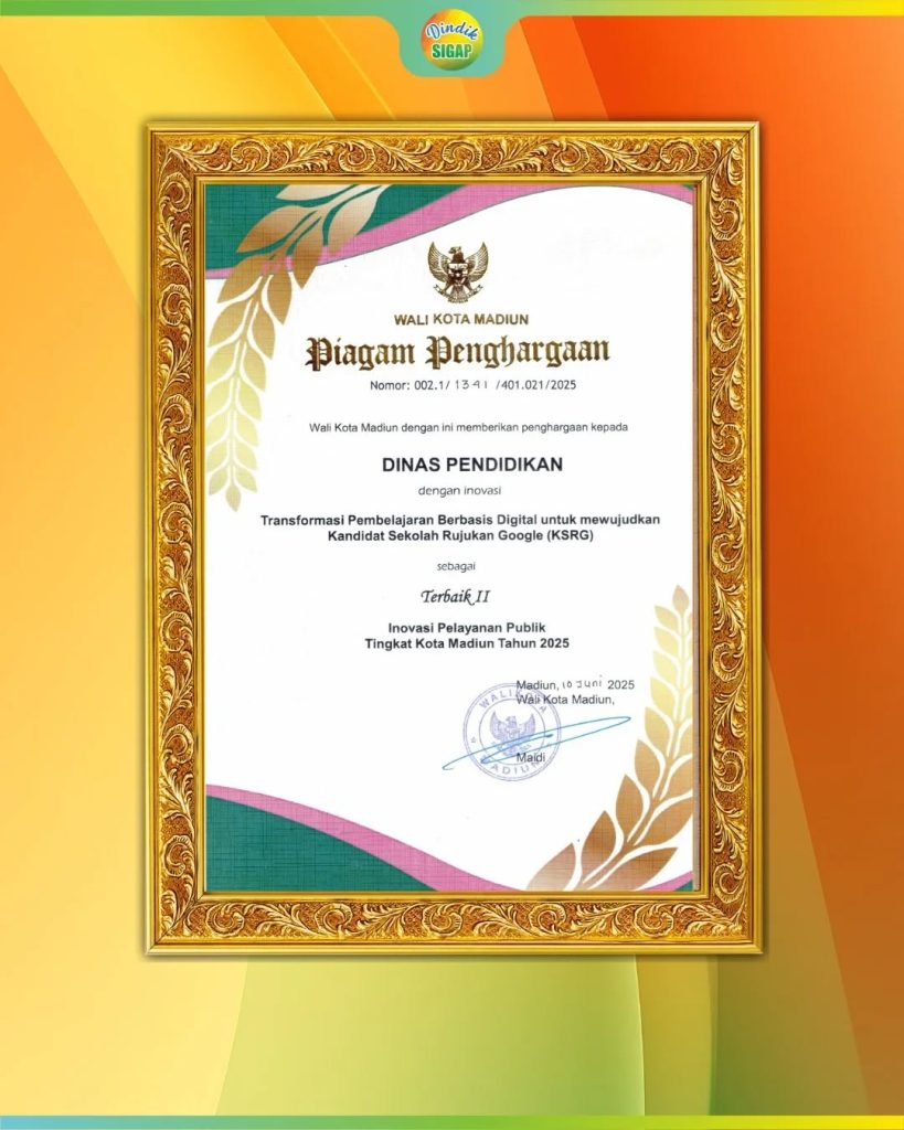 Dinas Pendidikan Kota Madiun (Dindik) kembali memperoleh penghargaan dalam Inovasi Pelayanan Publik Tingkat Kota Madiun Tahun 2025 sebagai Terbaik II dengan inovasi – Transformasi Pembelajaran Berbasis Digital untuk mewujudkan Kandidat Sekolah Rujukan Google (KSRG) –