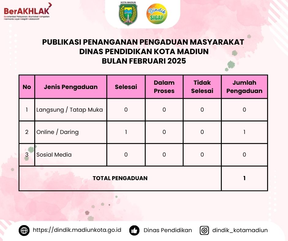 PUBLIKASI PENANGANAN PENGADUAN DINAS PENDIDIKAN KOTA MADIUN BULAN FEBRUARI 2025 dindik March 4, 2025 About the Author dindik Administrator Visit Website View All Posts Post navigation Previous: Selamat Menunaikan Ibadah Puasa Ramadhan 1446 H / 2025 MNext: LAYANAN DINAS PENDIDIKAN KOTA MADIUN