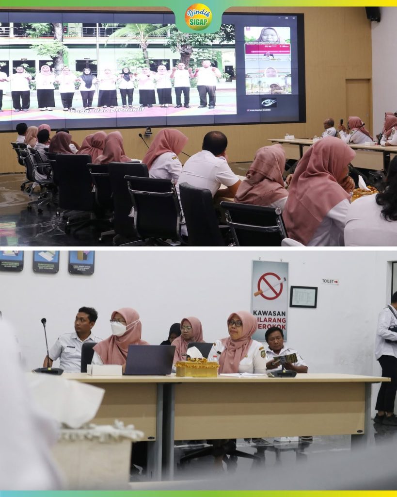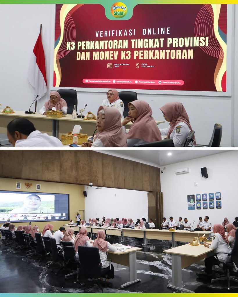 Verifikasi K3 Perkantoran dilaksanakan melalui zoom meeting yang dipaparkan oleh Kepala Dinas Pendidikan Kota Madiun Dr. Lismawati, S.Pd., M.Pd. bersama tim penilai Dinas Kesehatan Prov. Jawa Timur di Gedung GCIO, Rabu (8/10/2025).