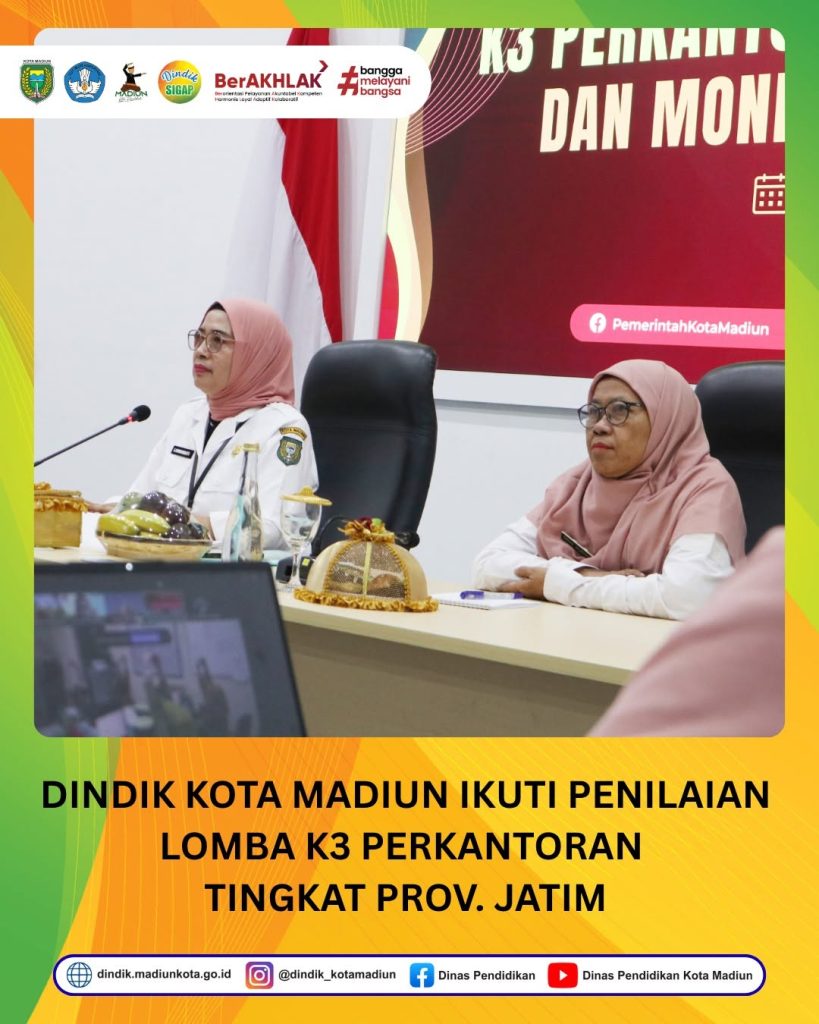 MADIUN – Dinas Pendidikan Kota Madiun terpilih sebagai Organisasi Perangkat Daerah untuk mewakili Kota Madiun dalam memaparkan verifikasi online terkait Keselamatan dan Kesehatan Kerja (K3) Perkantoran tingkat Provinsi Jawa Timur dalam rangka mewujudkan pekerja sehat dan produktif di Jawa Timur. Partisipasi ini menjadi wujud komitmen Dindik Kota Madiun dalam menciptakan lingkungan kerja yang bersih, aman, nyaman, serta tertata.