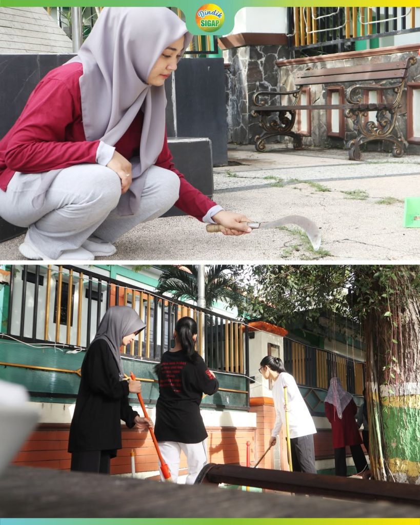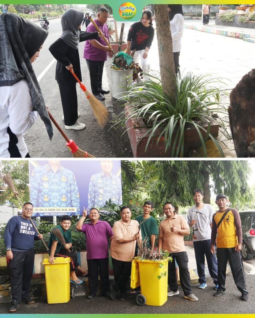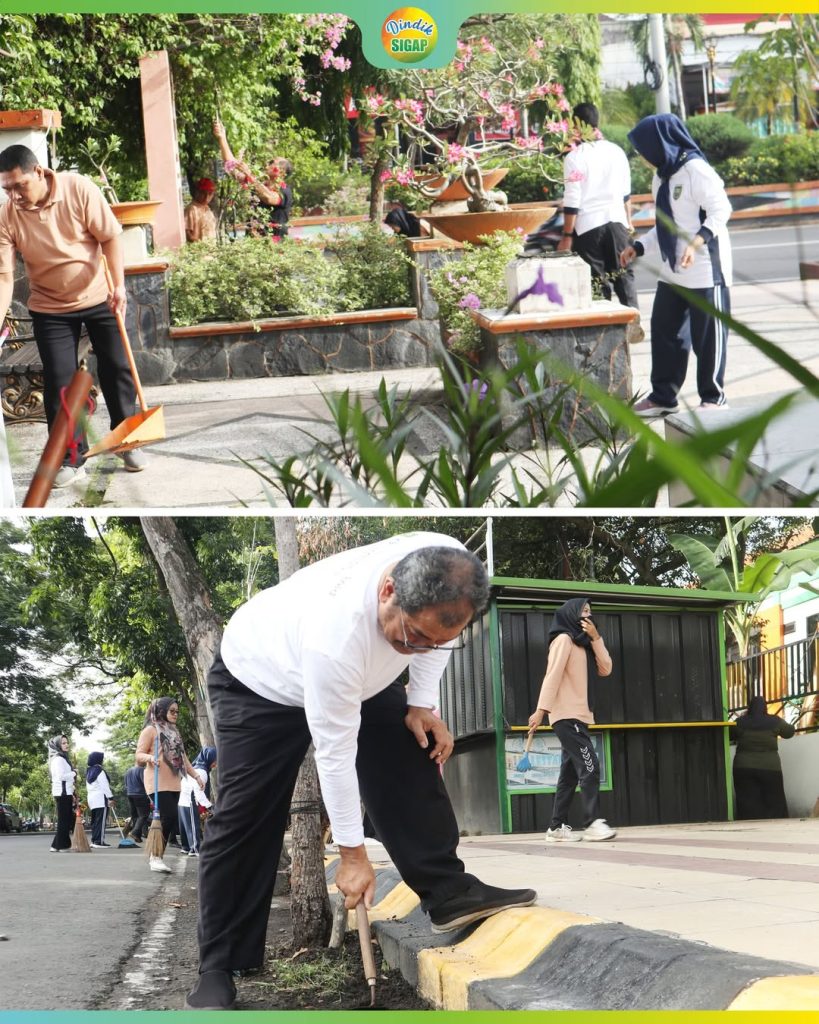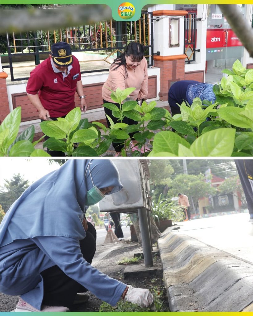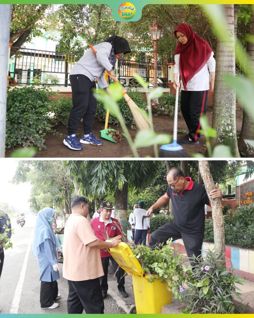 Para pegawai segera bergerak menuju area yang telah ditentukan. Ada yang menyapu halaman, memangkas rumput, membersihkan selokan, hingga menata taman kecil di depan kantor. Suasana penuh keakraban terlihat jelas; beberapa pegawai bekerja sambil bercanda ringan, sementara yang lain saling membantu memindahkan pot tanaman atau mengumpulkan sampah ke tempat penampungan.